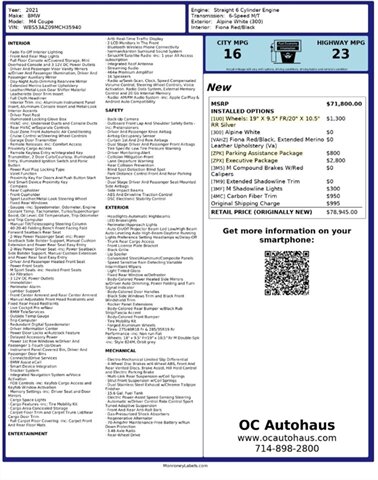 2021 BMW M4 Coupe ** Alpine White on Fiona Red/Black, Extended Merino Leather Upholstery ** PARKING ASSISTANCE PACKAGE - Drive Recorder - Parking Assistant Plus ** EXECUTIVE PACKAGE - WiFi Hotspot - Head-Up Display - Heated Steering Wheel - Power Tailgate - Gesture Control - Icon Adaptive LED Headlights w/Laserlight - Wireless Charging ** M Compound Brakes W/Red Calipers ** Extended Shadowline Trim ** M Shadowline Lights ** Carbon Fiber Trim ** Back up camera