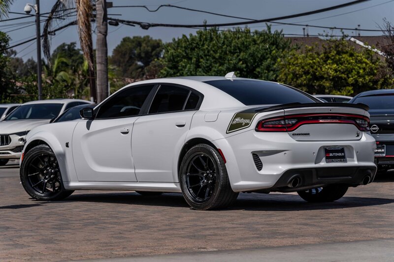 This 2023 Dodge Charger Scat Pack Widebody RWD is a performance-oriented, One owner clean carfax with the SWINGER SPECIAL EDITION LAST CALL. Four-door muscle car equipped with a 6.4L HEMI V8 engine, producing 485 horsepower and 475 lb-ft of torque. White Knuckle Clearcoat on Black, Nappa Alcantara Seat Trim W/Green Stitch ** 20-in wheels